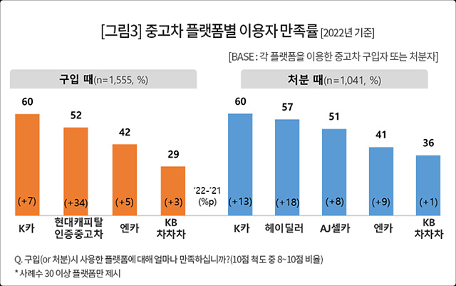 만족률(%, 10점 척도 중 8~10점)에서는 K카가 작년에 이어 구입, 처분 때 모두 1위를 지켰다. 그 뒤로 구입 서비스에서는 현대캐피탈인증중고차, 엔카, KB차차차 순이었으며, 처분서비스에서는 헤이딜러, AJ셀카, 엔카, KB차차차 순이었다. 대부분 플랫폼의 만족률이 상승한 점이 눈에 띈다. 엔카도 만족률이 상승했지만 업계 1위라는 위상에 비해서는 미흡하다[그림3].