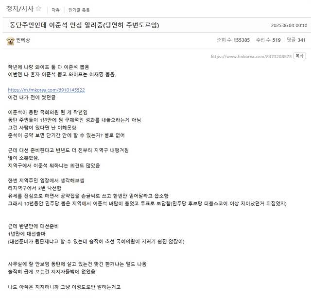 온라인 커뮤니티 에펨코리아에는 최근 ‘동탄주민인데 이준석 민심 알려줌(당연히 주변도르임)’이란 글이 올라왔다. 동탄 현지에서 이준석 의원의 민심을 여실히 보여주는 글이다.
