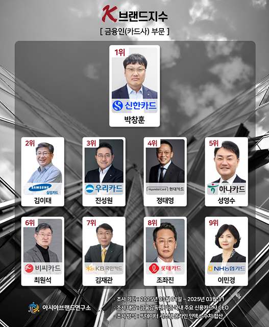 ‘K-브랜드지수’ 금융인 부문은 1위 박창훈 대표(신한카드)에 이어 2위 김이태 대표(삼성카드), 3위 진성원 대표(우리카드), 4위 정태영 대표(현대카드), 5위 성영수 대표(하나카드), 6위 최원석 대표(BC카드), 7위 김재관 대표(KB국민카드), 8위 조좌진 대표(롯데카드), 9위 이민경 대표(NH농협카드) 등이 그 뒤를 이었다.